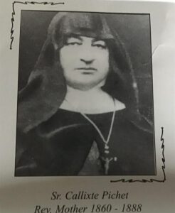 Mother Callixte Pichet was born in Cluny in 1823 and was professed at a very young age. She began her missionary vocation at the age of eighteen when she was sent to the island of Martinique in the Caribbean where she worked until 1852. On her return to France, she worked in many prestigious educational establishments. A few years later she was posted to Reunion in the Indian Ocean. From here she was sent to Dublin via Paris where she would collect two other sisters. Sister Bernadine Dumont and Sister Lazare Lefrancois.